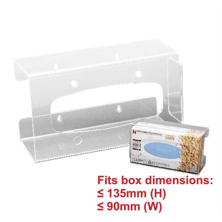 Ideal for storing glove box. Pre-drilled holes for wall-mounting. Size:250mm(L) x 102mm(W) x 145mm(H). Fits box dimensions ≤135mm(H) ≤90mm(W). Cleaning instructions: Use only soap and water on acrylic surface. Alcohol or ammonia-based disinfectants may cause cracks to appear. Note: Gloves not included