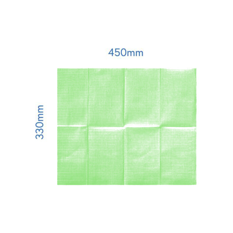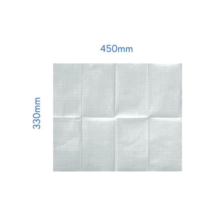 Provides NuMedical embossing pattern which allows moisture to flow horizontally across the towel, protecting patient's clothing. Bonds the layers of tissue securely together, eliminating separation of the layers. Size: 450mm(L) x 330mm(W).